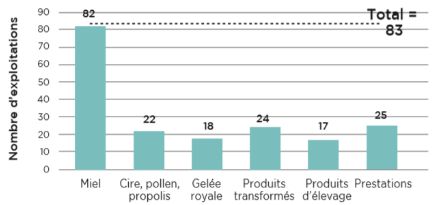 Pour 66 % des exploitations enquêtées, le miel représente plus de 80 % du chiffre d’affaires. Parmi les autres produits vendus, on retrouve la cire, le pollen et la propolis, la gelée royale, les produits transformés (nougat, pain d’épices…), les produits d’élevage (essaims, reines…), et les prestations comme les prestations de service de pollinisation[1].