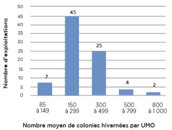 54 % des exploitations ont entre 150 et 299 colonies hivernées par UMO[3]. Aux extrêmes, on retrouve les exploitations spécialisées dans la production de miel, vendant en vrac et ne réalisant pas ou peu de transhumances (plus de 500 colonies par UMO) et, à l’inverse, le groupe des 85 à 149 colonies par UMO est constitué presque exclusivement d’exploitations au profil « spécialisée en gelée royale ».