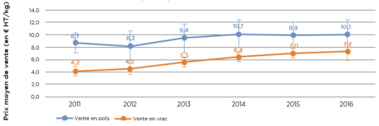 Sur l’ensemble des exploitations enquêtées, 66 sont orientées vers la production de miel. Globalement, le prix moyen de vente du miel a augmenté entre 2011 et 2016.